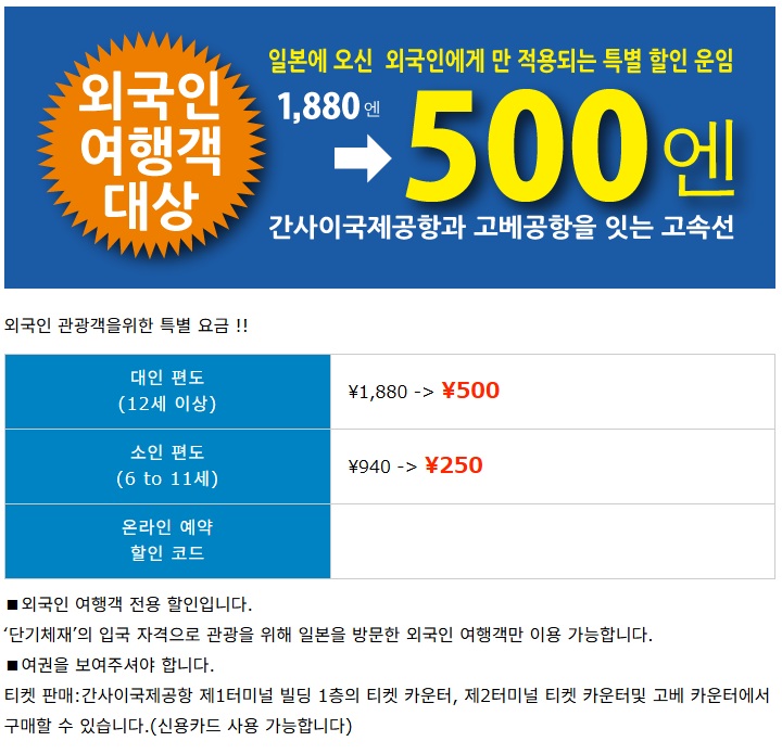 간사이 공항에서 고베 공항 간 빠른 이동이 가능한 베이셔틀 고속선의 외국인 한정 할인.